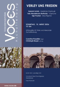 Das Vokalensemble Voces spannt einen musikalischen Bogen von der Renaissance bis zur Moderne. Unter dem Titel Verley uns Frieden erklingen Werke aus verschiedenen Epochen. Genießen Sie diesen musikalischen Nachmittag gemeinsam mit uns in der Stiftsbasilika Aschaffenburg.